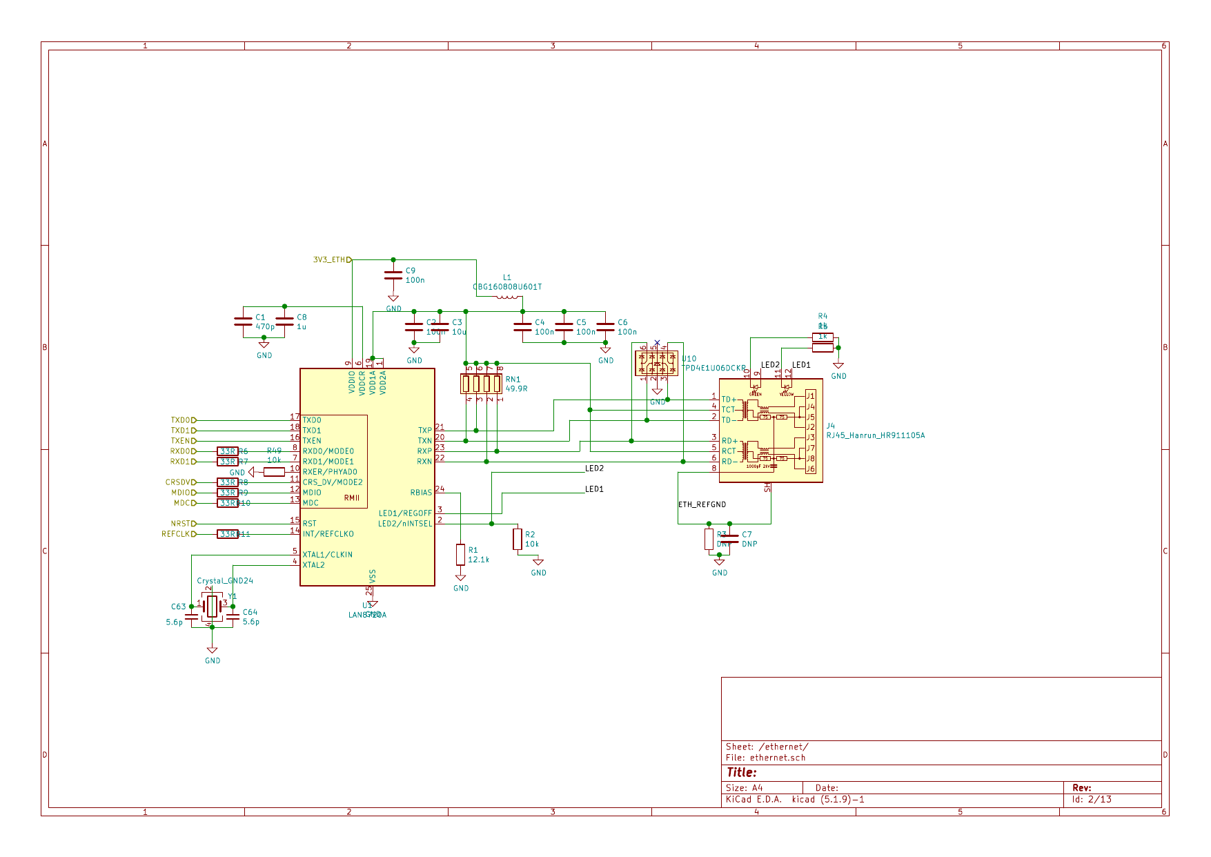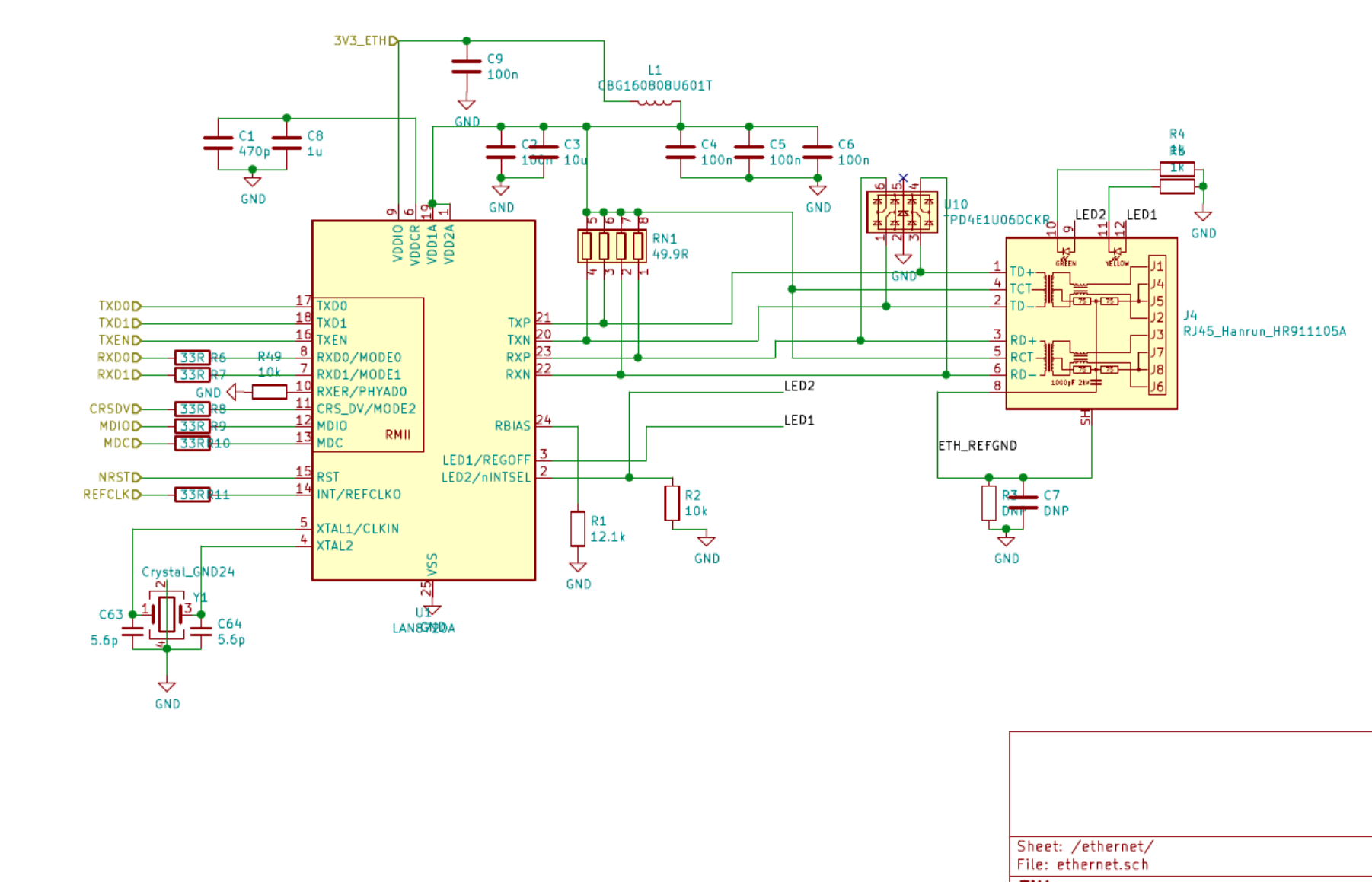 The board uses an RJ45 connector with integrated magnetics (HR911105A), including link and activity LEDs.