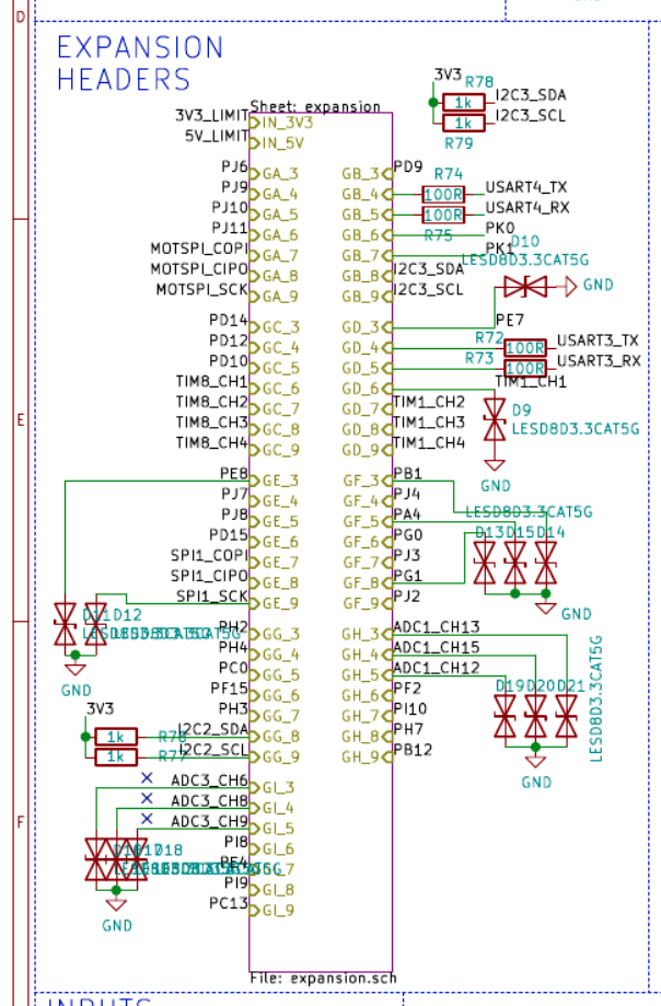 The expansion headers connect to dedicated GPIO banks on the MCU, with some headers providing special peripheral functions: