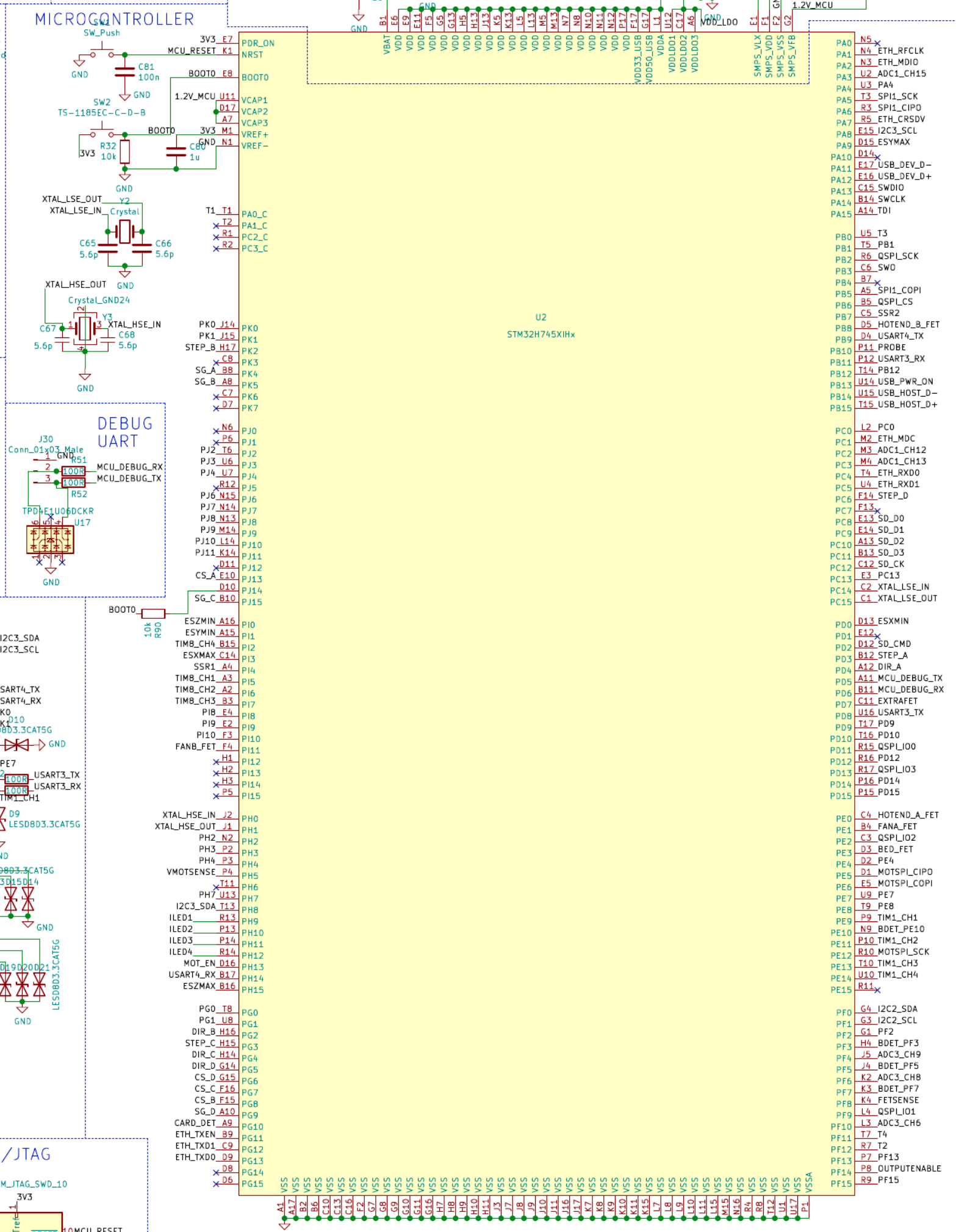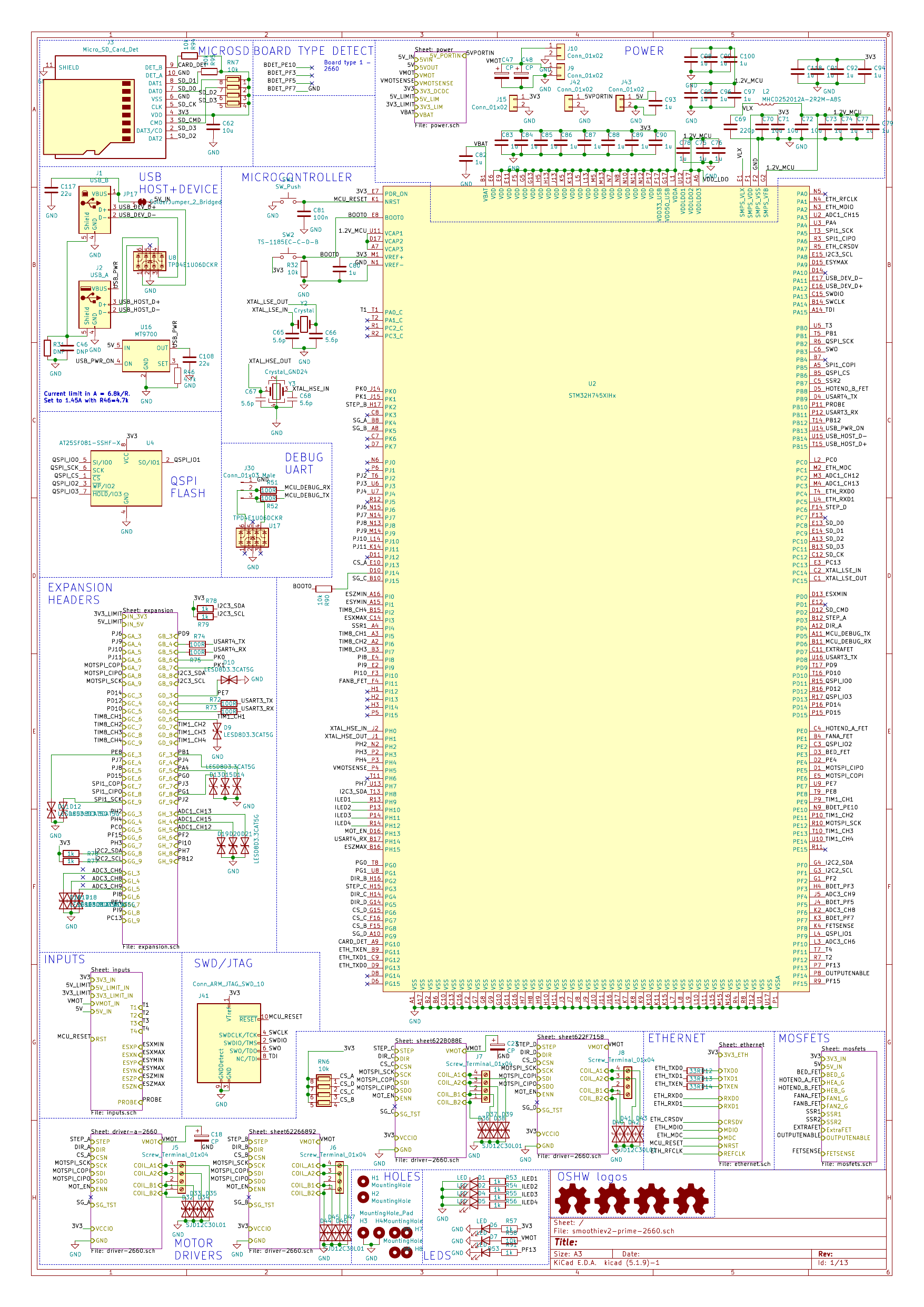 This page provides a complete technical reference for the Smoothieboard V2 Prime hardware, extracted from the KiCad schematics. It covers all major subsystems including the microcontroller, power system, motor drivers, MOSFETs, inputs, and expansion headers.