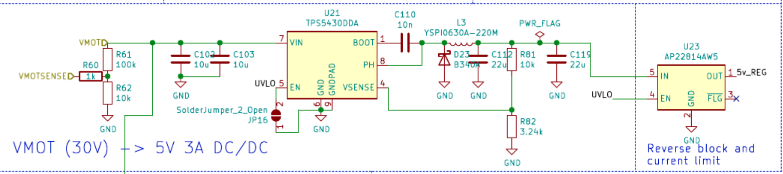 VMOT (12-24V) ──────┬──► TPS5430 DC-DC ──► 5V (3A) ──┬──► Ideal Diode