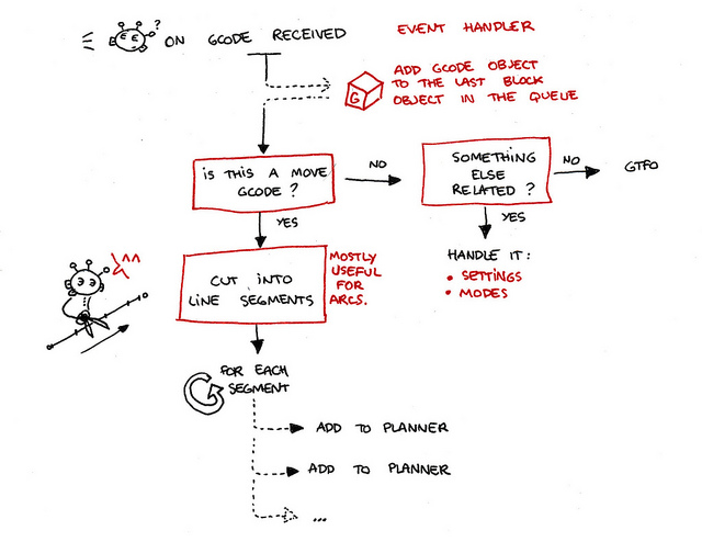 The Robot module listens to this event and is then triggered. It uses math to cut the requested move into line segments and passes those to the Planner module. There they are transformed into Block objects, containing speed, direction, and acceleration information. The acceleration profile for the Planner’s queue (list of upcoming Blocks) is re-computed to take the new Block into account, and finally, that Block is added to the queue.